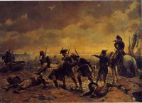 Naturally, Jannes IV (self-styled as "John"), the then monarch of Valahandia, flew into a fury upon learning of the removal of Hunt from power, sending a naval armada to reclaim Iustitia Island and capture the architects of the revolt. Even as Brannock worked to secure the city of Iustitia, an irregular army loyal to the monarchy, led by Sir Peter Fenwick, began coalescing on the southern end of the island, amassing troops in anticipation of the arrival of John's fleet, which made landfall in late May of that year. The subsequent Valahandian counter attack, led by General William Norton in the early summer of 1798, proved extremely devastating to Iustitian forces, resulting in the retreat of Brannock's army to Via Regis, and giving Fenwick's forces an opportunity to recapture Iustitia City in early September. Gradually, Iustitian forces were pushed out of the isle entirely, spending the winter of 1798-1799 entrenched in modern day Atlas, Passarelle. The following spring, Valahandian forces attempted a number of landings on the mainland, only to sustain heavy fire from a mix of asymmetrical (i.e. irregular) and conventional forces sent by Brannock to stymie their advance. In an effort to retake settlements on the mainland, Norton's forces became spread too thin, suffering devastating losses at the hands of well positioned artillery at Stallion Point in April 1799 and at Reef Beach the next month. Humiliated and battered, Norton's forces quickly withdrew from the mainland; Norton was consequently replaced by General Arthur Dering, though this change of leadership did little to improve the war effort for the Valahandians. | |||