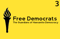 The Free Democratic Party (Haean: 자유민주당), more commonly referred to as the Free Democrats, is a Haesanite political party focused on economic growth and national development. The Free Democrats have been the most powerful political party in Haesan throughout much of the 21st century, and are the party of the current President of Haesan, Kim I-seul. The Free Democrats are the largest party in the Chamber of the Commonwealth and the largest opposition party in the Chamber of Deputies.